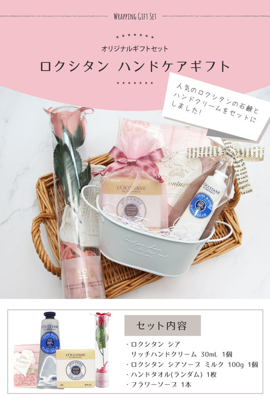 【ロクシタン ハンドクリーム 30mL】+【ハンドタオル】+【石鹸】+【ソープフラワー】4点 オリジナルギフトセット giftloc02